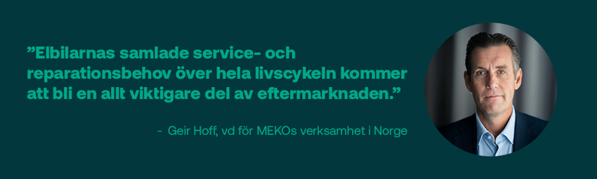 ”Vi ser den här omställningen på nära håll i våra verkstäder”, säger Geir Hoff, vd för MEKOs verksamhet i Norge. ”Genom Mekonomen och MECA arbetar vi redan dagligen med elbilar och de specifika reparationsbehov som följer när fordonsflottan växer och successivt mognar.”